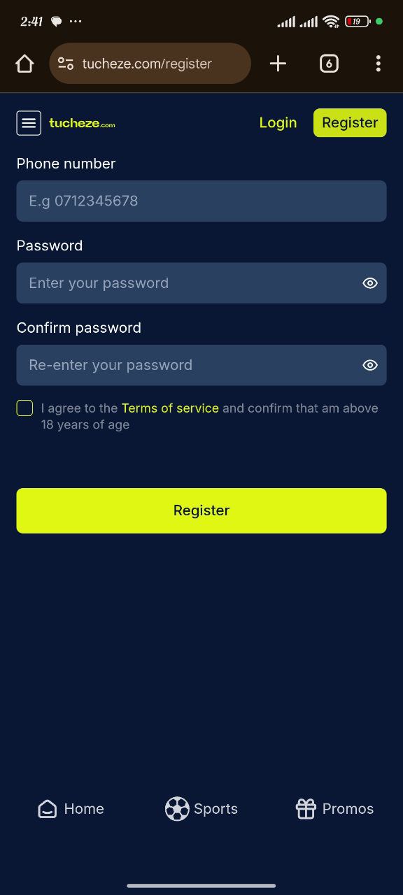 Finally, tap the ‘Register’ widget to complete the process and register your Tucheze bet login Kenya credentials.